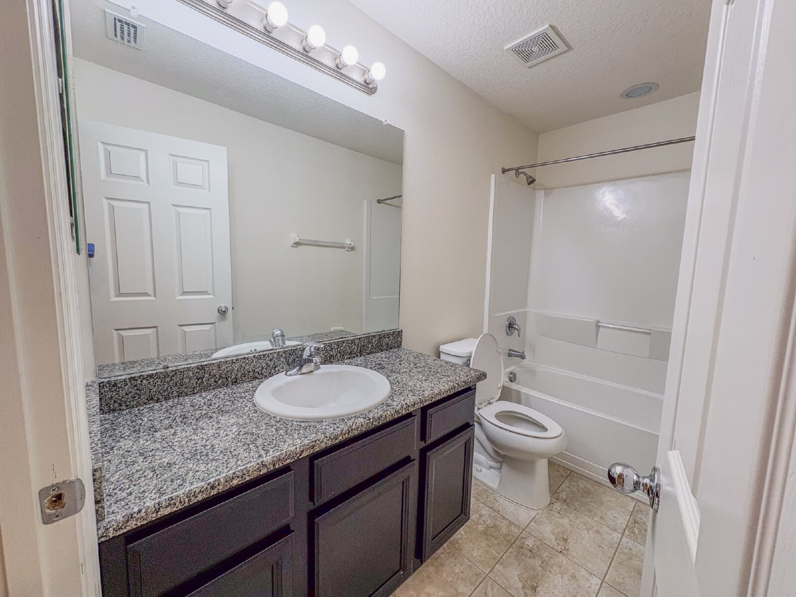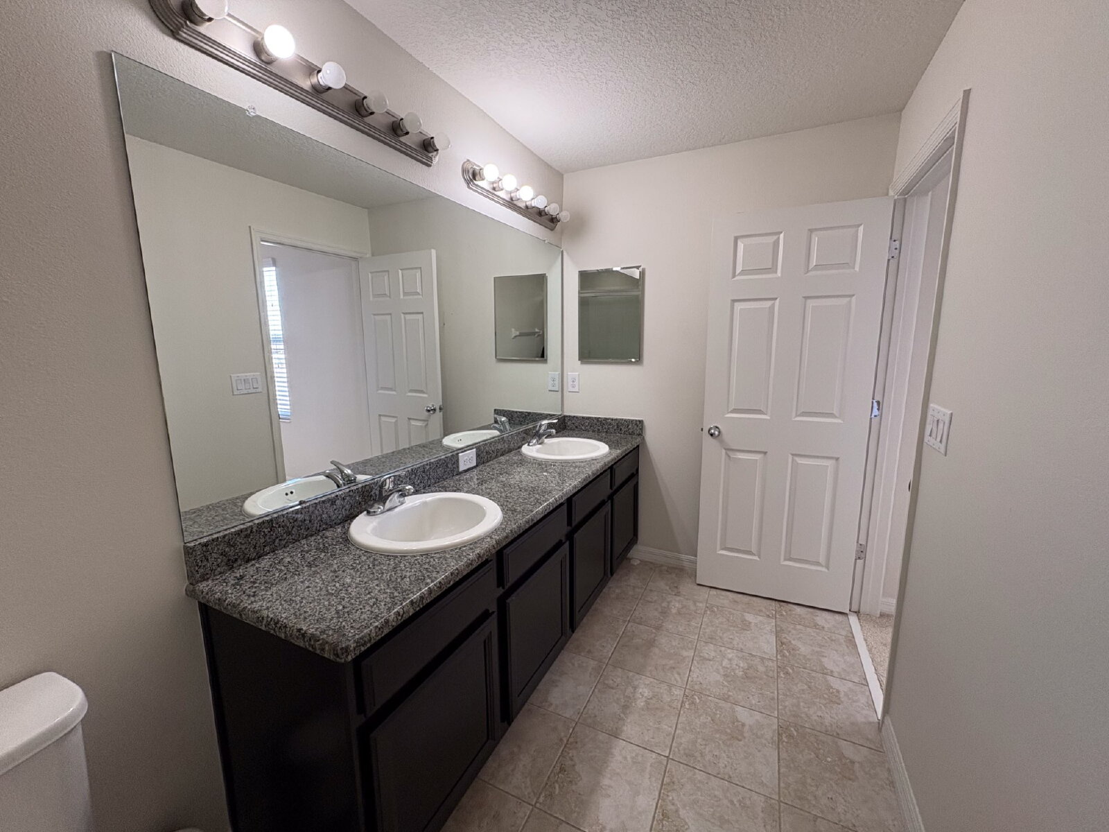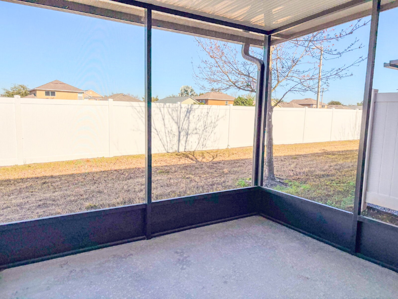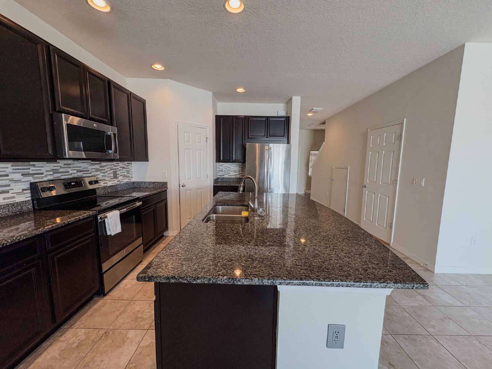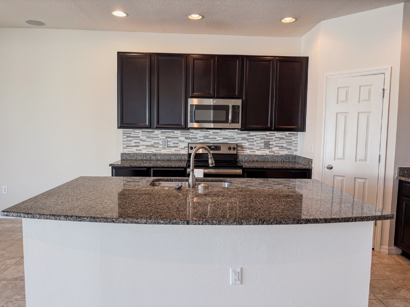 Inside, you’ll find an open and inviting layout with tile flooring throughout the main living areas. The kitchen overlooks the living and dining space and offers granite countertops, a stylish tile backsplash, a large pantry, stainless steel appliances, and a generous breakfast bar perfect for entertaining. The open floor plan flows seamlessly to the screened patio, creating the perfect space to relax and enjoy Florida living with no rear neighbors directly behind.